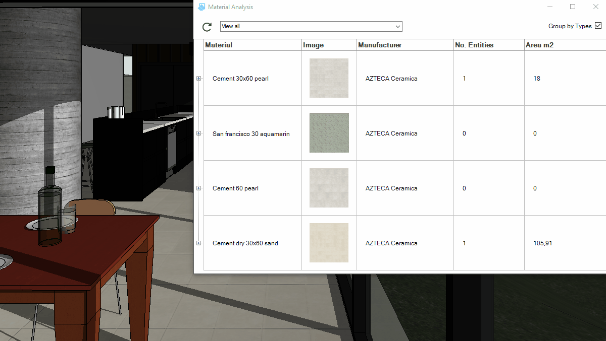 with this command, you can get the UpdateBIM materials included in the project and the number of square meters used in each building construction, for example in the sample project, we place materials on the floor of the kitchen.